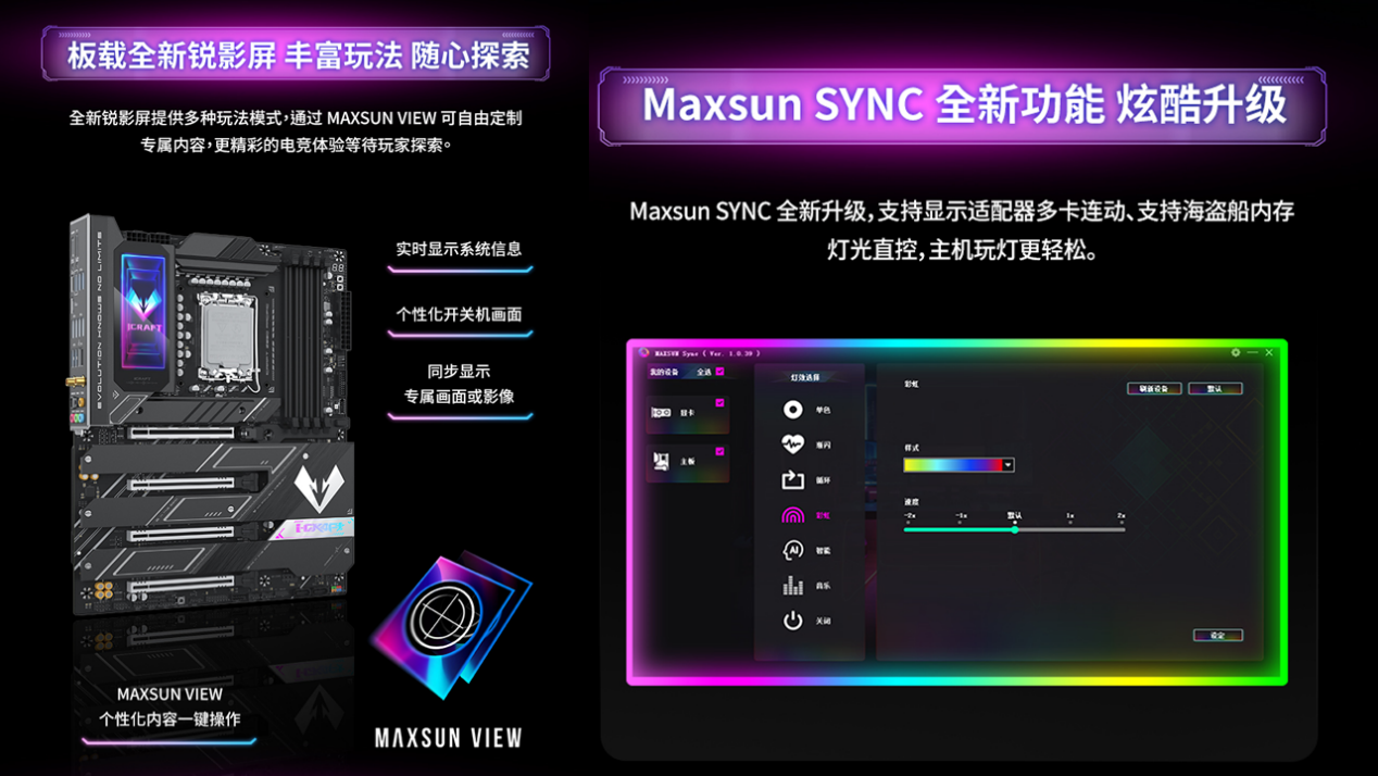 在功能設(shè)計(jì)上,銘瑄iCraft Z890 Pacific主板亮點(diǎn)滿(mǎn)滿(mǎn)。板載的全新銳影LED屏,能實(shí)時(shí)顯示CPU溫度、內(nèi)存頻率、供電狀態(tài)等核心參數(shù),更有多種玩法模式可選。激戰(zhàn)游戲時(shí)無(wú)需切換監(jiān)控軟件,就能直觀(guān)掌握硬件運(yùn)行情況,實(shí)用性拉滿(mǎn)。還支持RGB光效同步,可與顯卡、內(nèi)存等外設(shè)實(shí)現(xiàn)燈光聯(lián)動(dòng),隨心切換炫酷燈光效果,無(wú)論是黑色電競(jìng)主機(jī),還是純白海景房裝機(jī),都能完美適配,輕松打造氛圍感拉滿(mǎn)的裝機(jī)效果。