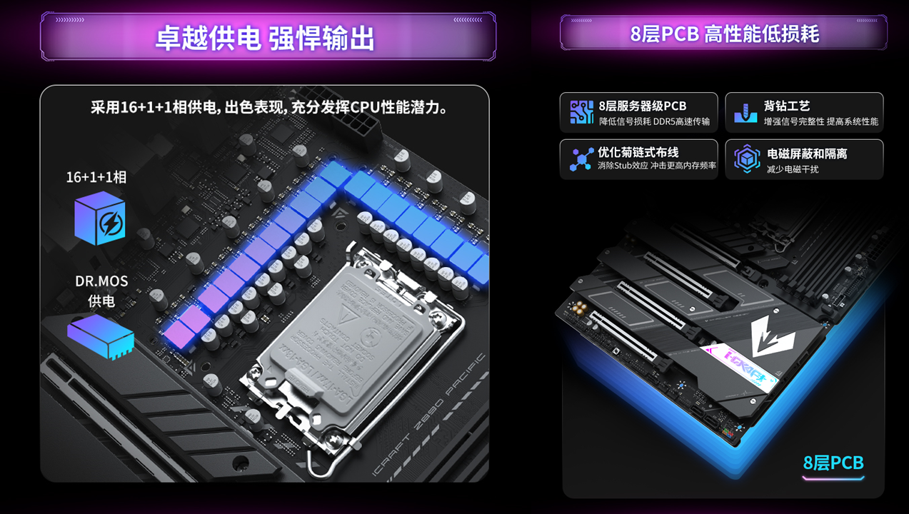 性能方面,這款主板更是實(shí)力強(qiáng)勁。16+1+1相 DR.MOS 供電,能充分釋放英特爾酷睿Ultra 7 265K處理器的全部潛能 —— 即便在游戲滿(mǎn)負(fù)載對(duì)戰(zhàn)場(chǎng)景下,也能確保處理器穩(wěn)定輸出,拒絕掉幀卡頓。搭配8 層服務(wù)器級(jí)低損耗 PCB 與背鉆工藝,優(yōu)化的菊鏈?zhǔn)讲季(xiàn)能消除 Stub 效應(yīng),電磁屏蔽和隔離設(shè)計(jì)則減少了電磁干擾,有效降低信號(hào)損耗、增強(qiáng)信號(hào)完整性。這不僅為供電穩(wěn)定性保駕護(hù)航,也為后續(xù)內(nèi)存高頻超頻、數(shù)據(jù)高速傳輸打下堅(jiān)實(shí)基礎(chǔ)。