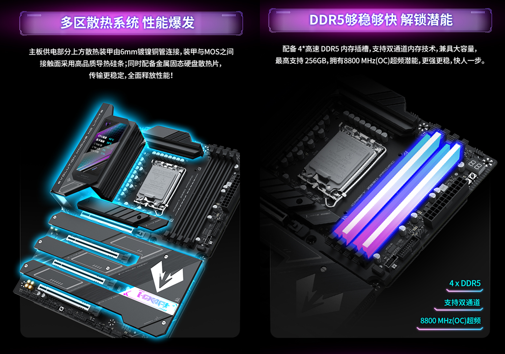 散熱設(shè)計(jì)方面這款主板同樣拉滿(mǎn),供電部分上方的冰原散熱裝甲由6mm鍍鎳銅管連接,裝甲與MOS之間的接觸面采用高品質(zhì)導(dǎo)熱硅條;同時(shí)配備金屬固態(tài)硬盤(pán)冰原散熱片,全面保障硬件冷靜運(yùn)行,性能持續(xù)在線(xiàn)不 “掉鏈”。 內(nèi)存方面,配備4條高速DDR5內(nèi)存插槽,支持雙通道內(nèi)存技術(shù),最高支持256GB容量,還擁有8800MHz (OC)超頻潛能,搭配CUDIMM內(nèi)存可輕松突破頻率上限,讓游戲的紋理加載速度大幅提升。