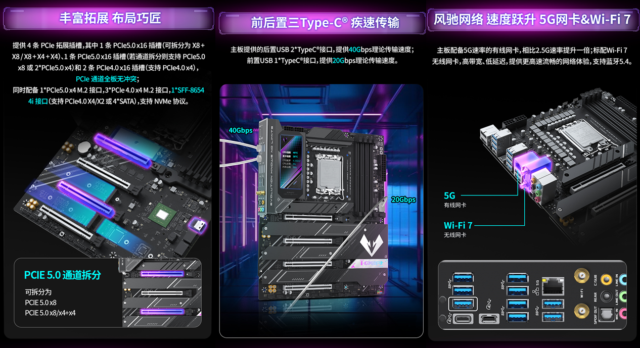 擴(kuò)展方面也十分出色,該主板提供4條PCle拓展插槽,其中1條PCIe 5.0 x16插槽支持靈活拆分,可根據(jù)需求調(diào)整為X8+X8 或X8+X4+X4模式,滿(mǎn)足同時(shí)搭載高性能顯卡與PCIe擴(kuò)展卡的需求;板載的SFF-8654 4i接口,可靈活擴(kuò)展為PCIe 4.0 x4通道或4個(gè) SATA 接口,適配多設(shè)備存儲(chǔ)方案。I/O區(qū)域的兩個(gè)40Gbps速率USB4 Type-C 接口,配合DP 1.4與HDMI 2.1視頻接口,輕松滿(mǎn)足多設(shè)備連接需求。網(wǎng)絡(luò)體驗(yàn)同樣無(wú)需擔(dān)憂(yōu),該主板搭載 Intel BE200 無(wú)線(xiàn)網(wǎng)卡與 Realtek RTL8126 有線(xiàn)網(wǎng)卡,支持 Wi-Fi 7 與 5G 有線(xiàn)網(wǎng)絡(luò),還具備藍(lán)牙 5.4 功能。無(wú)論是在復(fù)雜網(wǎng)絡(luò)環(huán)境下進(jìn)行聯(lián)機(jī)對(duì)戰(zhàn),還是連接無(wú)線(xiàn)外設(shè),都能實(shí)現(xiàn)低延遲、高穩(wěn)定的傳輸,讓你避免因網(wǎng)絡(luò)波動(dòng)錯(cuò)失戰(zhàn)機(jī)。