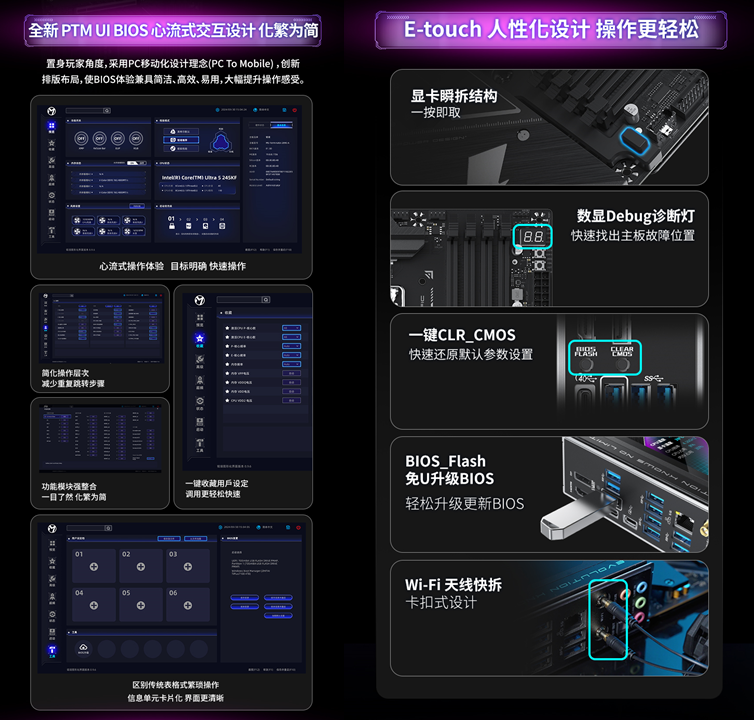 主板貼心的設(shè)計(jì),更是讓裝機(jī)和使用體驗(yàn)直接拉滿(mǎn)。全新升級(jí)的PTM UI BIOS,借鑒手機(jī) APP 的交互邏輯,采用模塊化設(shè)計(jì),交互層級(jí)不超過(guò) 2 層,手機(jī)端風(fēng)格的卡片式界面,讓復(fù)雜的 BIOS 設(shè)置變得簡(jiǎn)單易懂,即使是新手玩家也能輕松上手。顯卡瞬拆結(jié)構(gòu)一按即取,不用費(fèi)力擰螺絲;分布式 Debug 診斷燈能快速定位故障,小白也能輕松排查問(wèn)題;CLR_CMOS 快捷按鈕、BIOS_Flash 免 U 升級(jí)、Wi-Fi 天線(xiàn)快拆等設(shè)計(jì),全程省心省力。