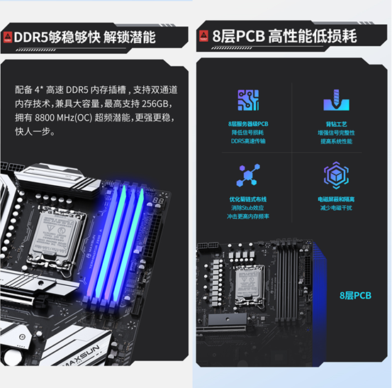 內存拓展與性能表現上,這款主板同樣實力出眾。它配備4*高速DDR5內存插槽,支持雙通道內存技術,兼具大容量,最高支持256GB,擁有8800 MHz(OC)超頻潛能,更強更穩(wěn)。再加上英特爾酷睿 Ultra 7 265K 處理器對 CUDIMM內存的支持,更為沖擊高內存頻率提供了可能。對游戲玩家和追求高性能的用戶來說,高頻內存能夠有效提升系統(tǒng)的數據讀寫速度,減少游戲加載時間,提升多任務處理能力,帶來更流暢的畫面切換和更快的場景加載體驗。此外,主板采用 8 層服務器級 PCB 設計,配合背鉆工藝和優(yōu)化的菊鏈式布線,有效降低信號損耗,增強信號完整性,消除 Stub 效應,不僅保障了 DDR5 內存的高速穩(wěn)定傳輸,更減少了電磁干擾,為整套平臺的高性能運行奠定了堅實基礎。