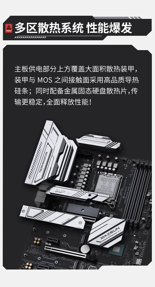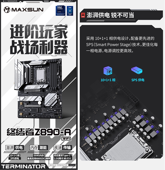 這款主板外觀(guān)上延續(xù)了終結(jié)者系列的經(jīng)典配色,采用黑色 PCB 與銀色裝甲的搭配,整體風(fēng)格沉穩(wěn)大氣又不失電競(jìng)范兒。相較于上一代產(chǎn)品,在性能和外觀(guān)上都得到了全面升級(jí)。主板搭載 10+1+1 相供電設(shè)計(jì),配備更先進(jìn)的SPS(Smart Power Stage)技術(shù),更佳化每一相電源,電源調(diào)控更高效、更穩(wěn)定。即便在處理器長(zhǎng)時(shí)間高負(fù)載場(chǎng)景下,也能持續(xù)輸出強(qiáng)勁且平穩(wěn)的電力,為 3A 游戲的高幀率運(yùn)行、多任務(wù)的流暢處理筑牢動(dòng)力根基。