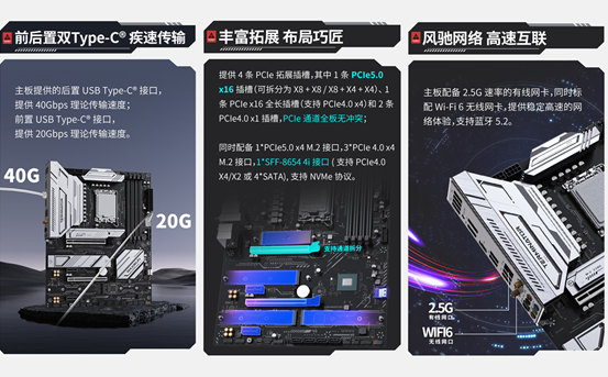 在拓展性方面,該主板展現(xiàn)出了強(qiáng)大的兼容性和實(shí)用性,能夠滿(mǎn)足玩家多樣化的硬件拓展需求。主板提供 4 條 PCle 拓展插槽,其中 1 條 PCle5.0 x16 插槽(可拆分為 X8+X8/X8+X4+X4)、1 條 PCle x16 全長(zhǎng)插槽(支持 PCle4.0 x4)和 2 條 PCle4.0 x1 插槽,全板 PCle 通道無(wú)沖突。存儲(chǔ)接口方面,主板配備 1 個(gè) PCle5.0 x4 M.2 接口、3 個(gè) PCle4.0 x4 M.2 接口以及 1 個(gè) SFF-8654 4i 接口(支持 PCle4.0 X4/X2 或 4*SATA),且均支持 NVMe 協(xié)議。此外,主板還配備前后置雙 Type-C 接口,后置 USB Type-C 接口理論傳輸速度可達(dá) 40Gbps,前置 USB Type-C 接口理論傳輸速度為 20Gbps,輕松實(shí)現(xiàn)疾速傳輸,滿(mǎn)足玩家的高效數(shù)據(jù)交互需求。網(wǎng)絡(luò)體驗(yàn)也不拉胯,主板配備 2.5G 速率有線(xiàn)網(wǎng)卡和 Wi-Fi 6 無(wú)線(xiàn)網(wǎng)卡,同時(shí)支持藍(lán)牙 5.2,有線(xiàn)、無(wú)線(xiàn)雙模式自由選擇,無(wú)需額外升級(jí)。不管是游戲?qū)?zhàn)時(shí)的低延遲需求,還是遠(yuǎn)程辦公的穩(wěn)定連接要求,都能輕松應(yīng)對(duì)。