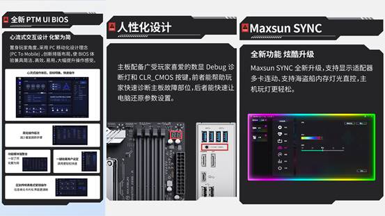 除了強(qiáng)悍的性能,這款主板在操作便捷性和個(gè)性化上也格外貼心。全新升級(jí)的 PTM UI BIOS,借鑒了手機(jī) APP 的交互邏輯,采用模塊化設(shè)計(jì),交互層級(jí)不超過(guò) 2 層?ㄆ降慕缑嬉荒苛巳,就算是裝機(jī)新手,也能輕松搞定 BIOS 設(shè)置。分布式 Debug 診斷燈和 CLR_CMOS 快捷按鈕,更是能快速定位故障,讓裝機(jī)過(guò)程省心又省力。它還支持RGB光效同步,可與顯卡、內(nèi)存等外設(shè)實(shí)現(xiàn)燈光聯(lián)動(dòng),炫酷燈光效果隨心切換,無(wú)論是打造酷炫的黑色電競(jìng)主機(jī),還是組裝顏值爆表的純白海景房,都能完美適配,輕松拿捏氛圍感。
