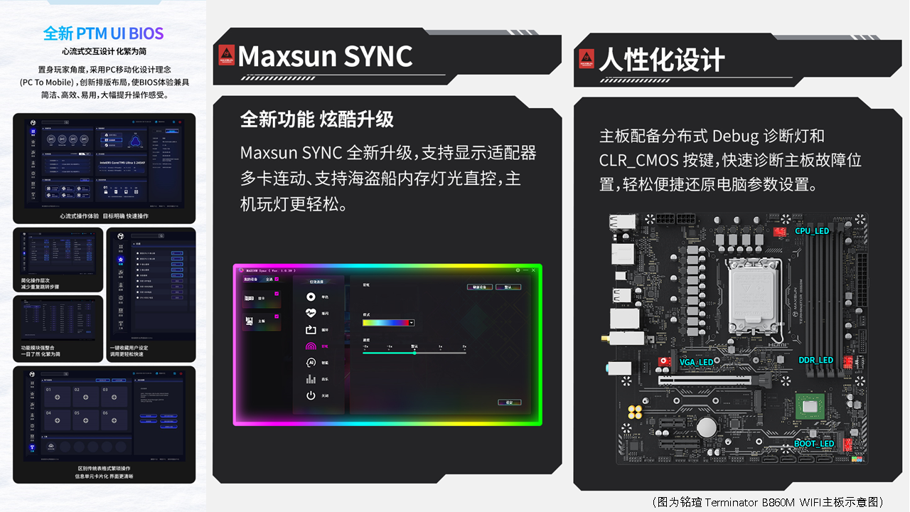 除了各有特色的硬核規(guī)格,銘瑄這四款主板均搭載全新 PTM UI BIOS,模塊化設(shè)計(jì)讓交互層級不超 2 層,新手也能輕松操作;同時(shí)配備分布式 Debug 診斷燈、CLR_CMOS 快捷按鈕,故障排查更省心,還支持 RGB 光效同步,可與外設(shè)聯(lián)動(dòng)打造個(gè)性化裝機(jī)氛圍,從操作便捷性到個(gè)性化設(shè)計(jì)實(shí)現(xiàn)全方位體驗(yàn)升級。